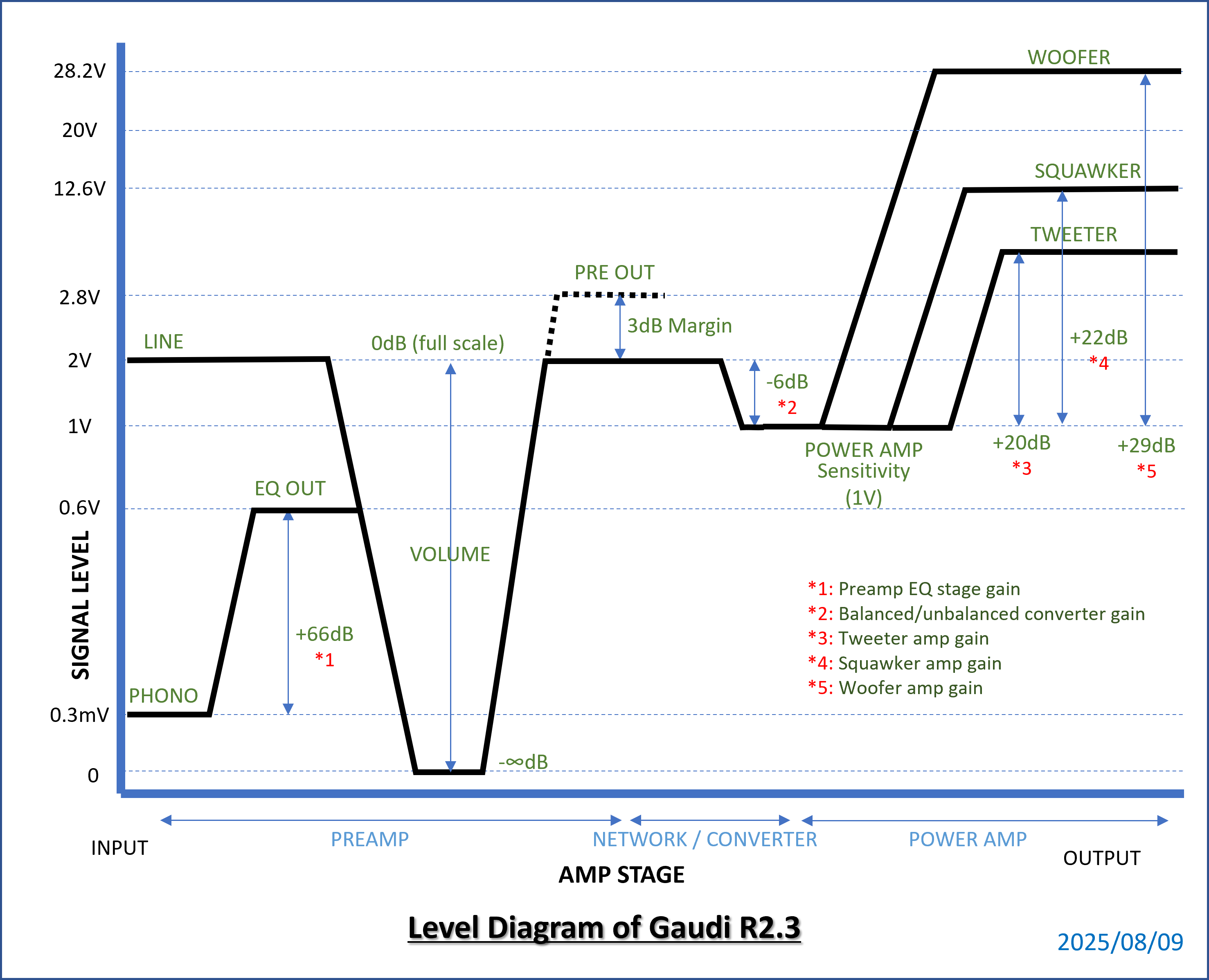 Because the preamp and the crossover network have different gains in the system design, a new level diagram was created.