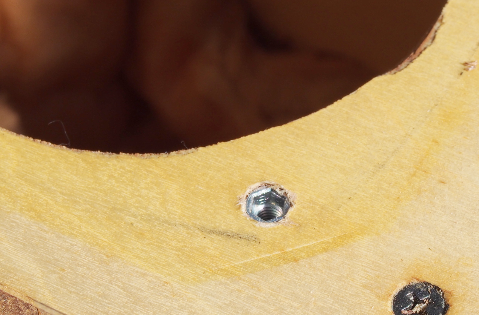 ここまでの工程はボンドが固まらないうちに、手早く行います。最終的に木ねじを完全に締め付けると、接合部からボンドがかなりはみ出しますが、とりあえずそのままにしておきます。