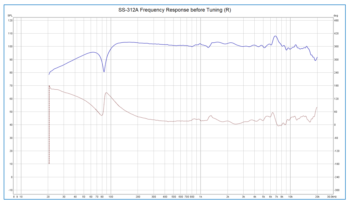 6.8kHzにあるピークはSPユニット固有のものです。FF105WKのカタログ・データに同様なピークが見られます。これはわざとこのような特性にしているのだと思います。超高音域にピークをつくると、躍動感のある生き生きとした音に聞こえる傾向があるからです。