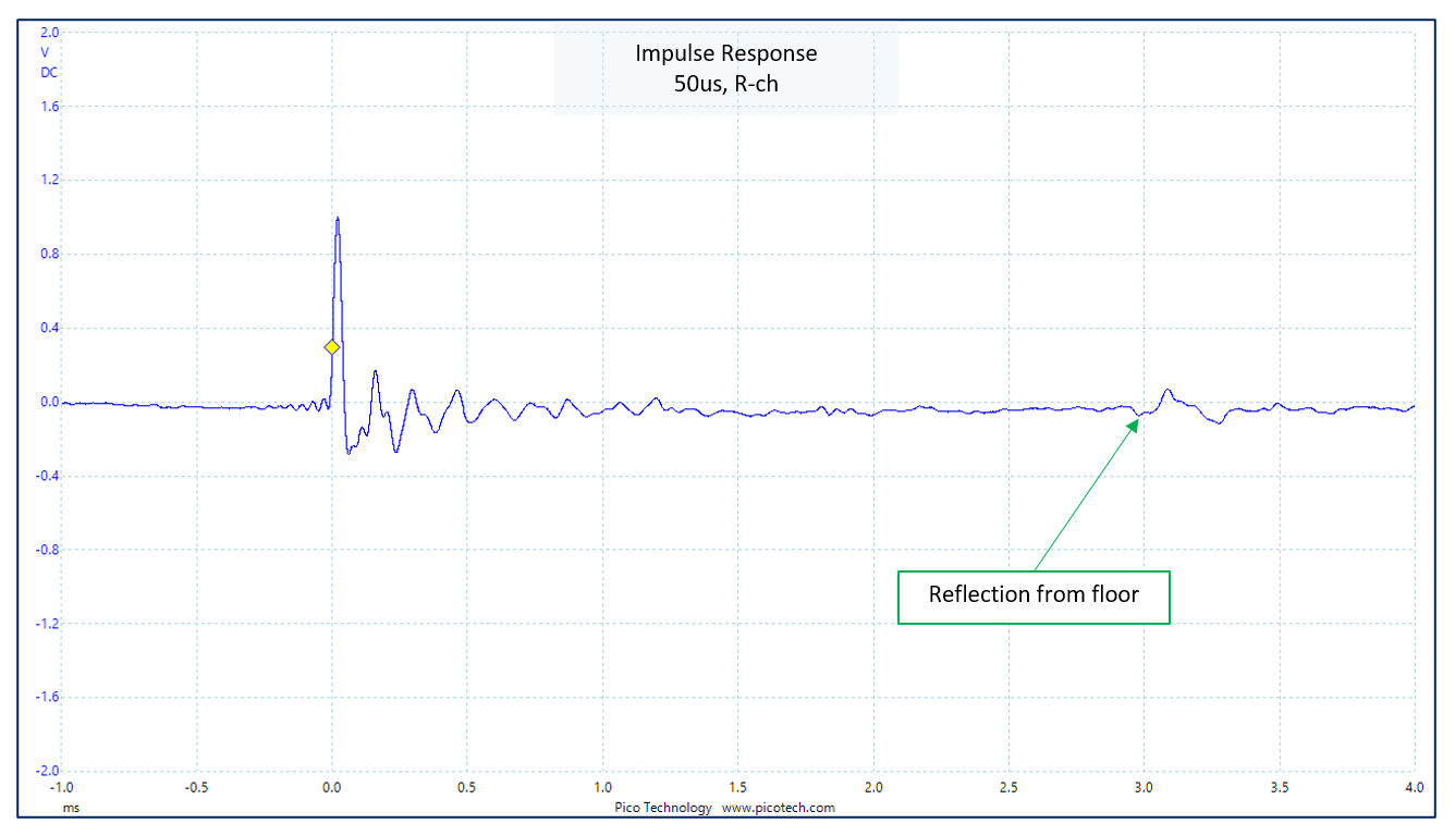 再度測定した結果、下図のようになりました。右下の図は、REWではなくオシロスコープを用いて測定したインパルス応答です。50usのインパルスを使用しました。